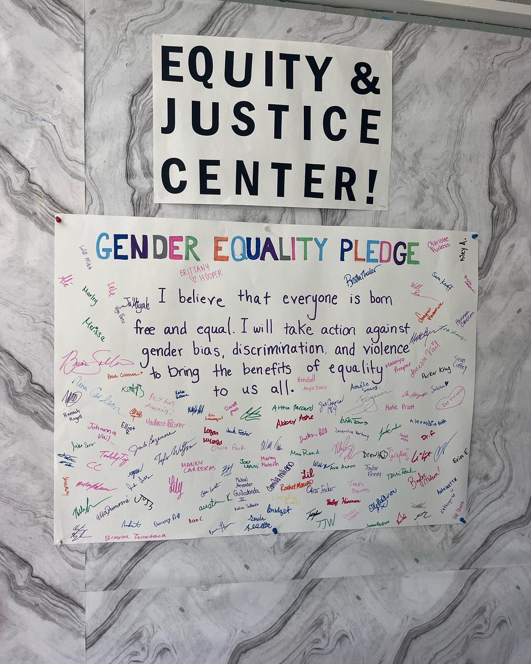 Girl Up Wooster, a Club in Connecticut, created a Gender Equality Pledge for students to sign, reading: “I believe that everyone is born free and equal. I will take action against gender bias, discrimination, and violence to bring the benefits of equality to us all.” Students of all genders signed the pledge, showing the importance of community in the fight for gender justice.